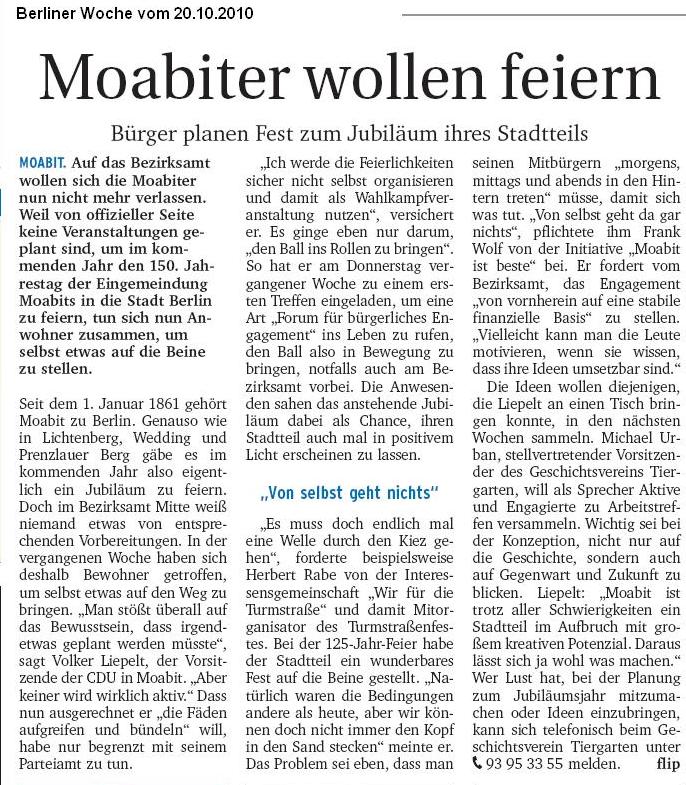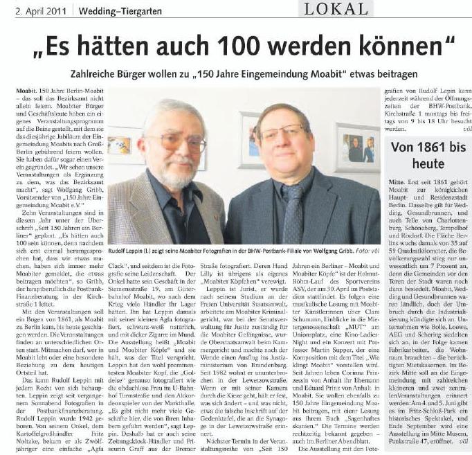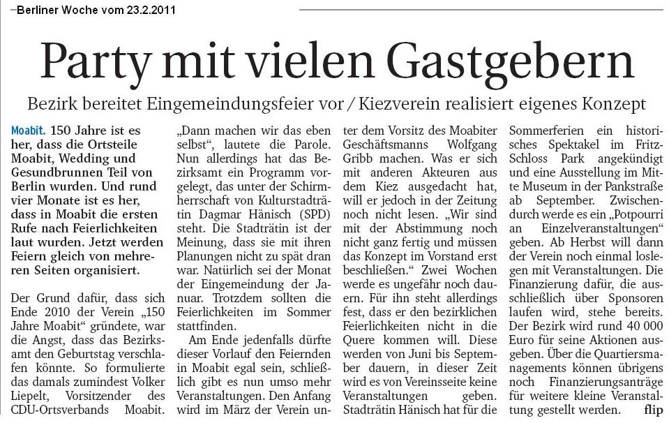 Hieß es noch im Oktober 2010 die "Moabiter wollen feiern", hatten sich danach die Vorbereitungen des Bezirksamt und des extra gegründeten Vereins unabhängig voneinander ein wenig verselbstständigt, so dass schließlich erklärt wurde, die Veranstaltungen des Vereins nicht in der Zeit von Juni bis September zu organisieren, um der Veranstaltungsreihe des Kulturamts nicht in die Quere zu kommen. Eigentlich schade, dass nicht eingemeinsames Programm mit allen Aktivitäten gibt. Der Verein startete mit der Austellung "Moabiter Köpfe" des Hobbyfotografen Rudolf Leppin bereits im April. Weitere Veranstaltungen sind ab Oktober angekündigt.