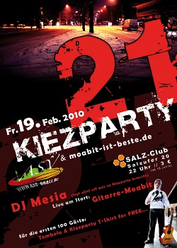 Aufgepasst: Die 21 Kiezparty startet am 19. Feb. 2010 ab 22 Uhr im Salz-Club (Salzufer 20). Gemeinsam mit den ASV B-Ballern freuen wir uns auf partyfreudiges Publikum, sprich auf DICH. An den Plattenspielern unterhält euch Berlins Urgestein DJ Mesia mit sattem Sound der zum tanzen anregt. Ob Classics, House, Elektro oder guter alter HipHop Sound, alles ist dabei. Live gibt es einen Kurzauftritt von Gitarre-Moabit, beste!!! Die ersten 100 Gäste nehmen kostenlos an einer großartigen Tombola teil und erhalten zusätzlich ein Kiezparty T-Shirt. Was will man mehr für geschenkte 3 € Eintritt?