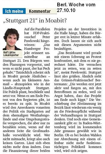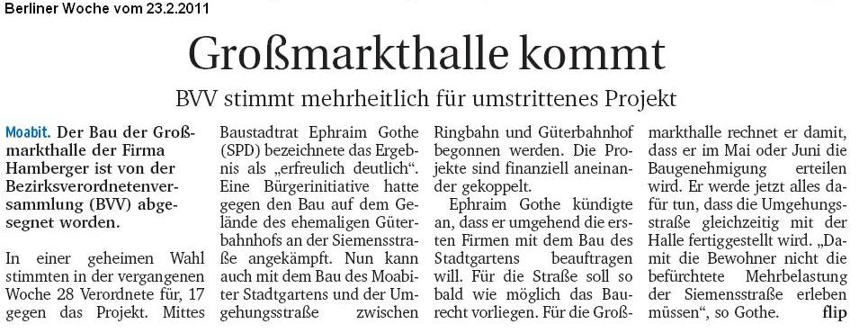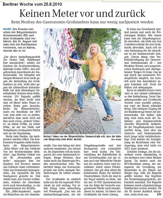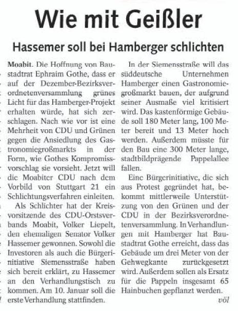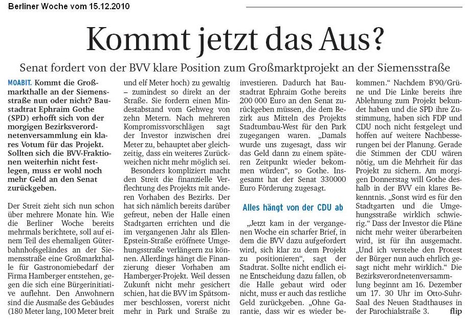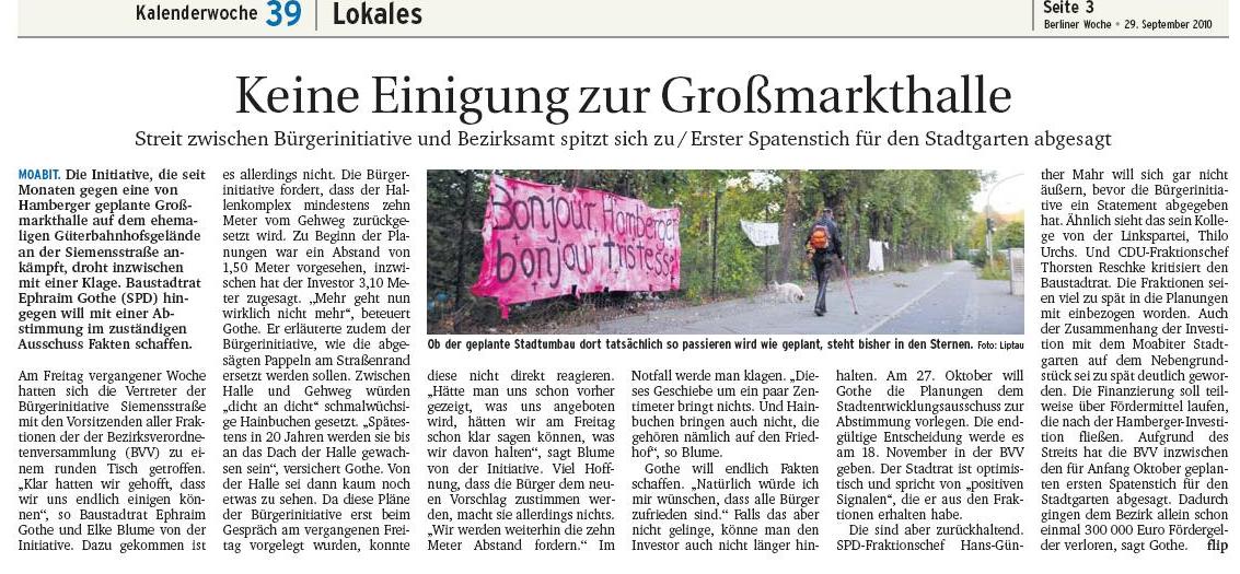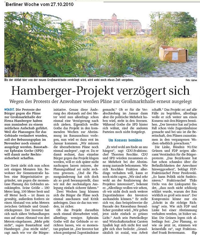 Tagesspiegel vom 5.8.2010, Berliner Woche vom 25.8.2010: Keinen Meter vor und zurück, taz vom 3.9.2010: Geliebte Schutthalde, Berliner Woche vom 29.9.2010: Keine Einigung zur Großmarkthalle und jetzt aktuell in der Berliner Woche vom 27.10.2010 Hamberger Projekt verzögert sich mit der Ankündigung der erneuten Auslegung des B-Plans und der Verschiebung der Abstimmung in der BVV auf Januar und mit dem Kommentar Stuttgart 21 in Moabit.