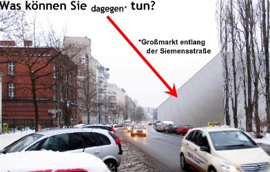 Die neugegründete Bürgerinitiative Siemensstraße startet ihre erste Aktion. Auch die Unterschriftensammlung läuft an. (Nächstes Treffen der BI am Montag, 18. Januar um 19 Uhr im Nachbarschaftstreff, Stadtschloss Moabit, Rostocker Straße 32.) Bei der Bürgerfragestunde in der BVV (Bezirksverordnetenversammlung) Mitte am Donnerstag, den 21. Januar kann ein Mitglied der Initiative 3 Fragen (Fragen siehe ganz unten) stellen, die das Bezirksamt und die einzelnen Fraktionen in der BVV beantworten werden: