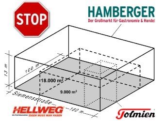 Auf dem ehemaligen Güterbahnhof Moabit beabsichtigt die Firma Hamberger den größten C&C-Gastronomiegroßmarkt in Deutschland zu errichten. Die 180 x 100 m große und 13 m hohe Gewerbehalle soll unmittelbar an den Gehweg der Siemensstraße grenzen (auf der Graphik rechts ist das Größenverhältnis von Hamberger, Hellweg und Tolmien entlang der Siemens-/Quitzowstraße anschaulich zu erkennen). Dafür wird die 300 m lange Baumreihe vollständig gefällt. Pro Tag werden 100 LKWs und 700 PKWs zusätzlich die Lebensqualität in Moabit belasten. Die Zufahrt der Anlieferung wird sich auf Höhe der James-Krüss-Grundschule befinden. Eine, für das gesamte Wohngebiet wichtige, Frischluftschneise wird verschlossen. 97% des Grundstücks sollen versiegelt bzw. überbaut werden. Derzeit läuft ein Bebauungsplanverfahren, bei dem nicht nur die Belange der Bewohner sondern auch die Maßgaben des Berliner Umweltatlas eklatant außer Acht gelassen werden. Wir stellen uns gegen eine solche Vorgehensweise und fordern eine massive Überarbeitung der vorliegenden Planung.