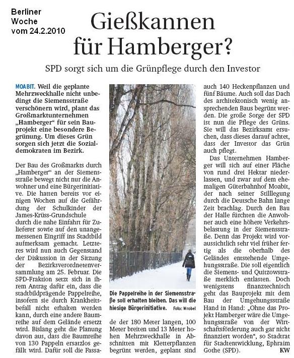 Die Berliner Woche brachte am 24.2.2010: Gießkannen für Hamberger? SPD sorgt sich um die Grünpflege durch den Investor.