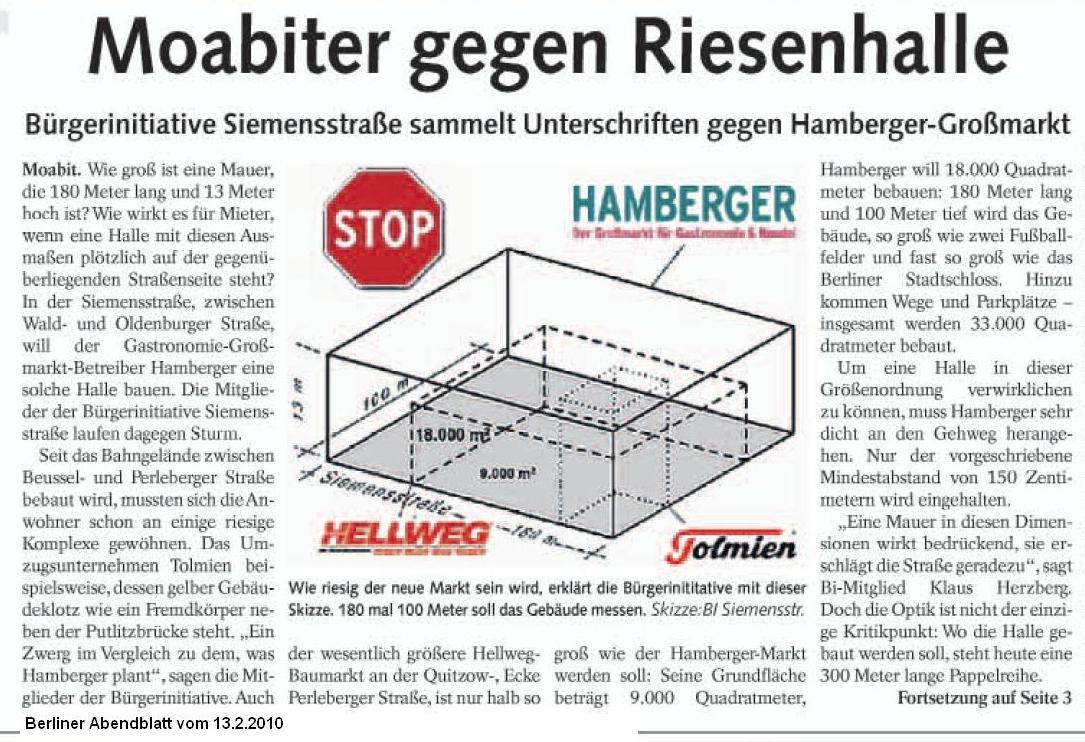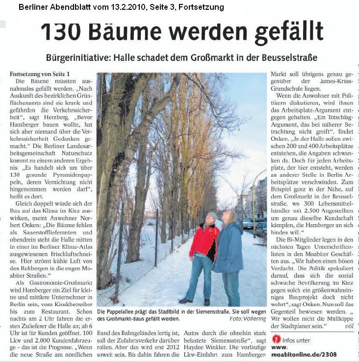 Und hier der Artikel aus dem Berliner Abendblatt vom 13.2.2010, weil der Link zum pdf ja in ein paar Wochen nicht mehr funktionieren wird. Moabiter gegen Riesenhalle (Teil 1) und 130 Bäume werden gefällt (Teil 2).