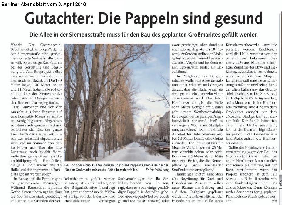Berliner Abendblatt vom 3.4.2010 berichtet über das Gegen-Baumgutachten unter dem Titel Gutachter: Die Pappeln sind gesund.