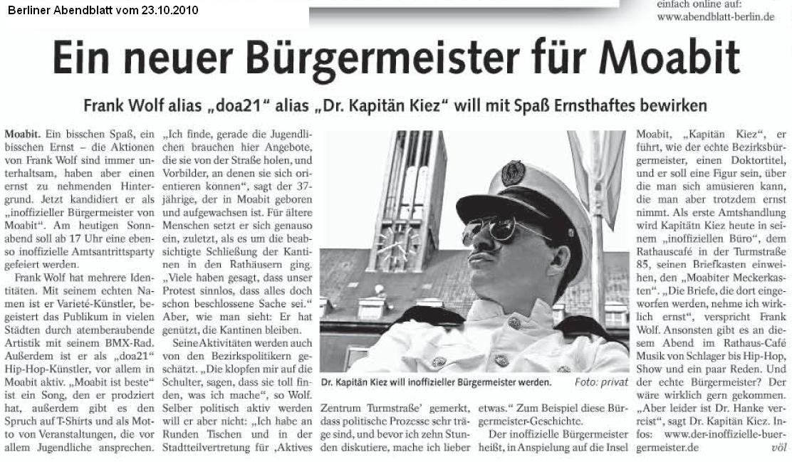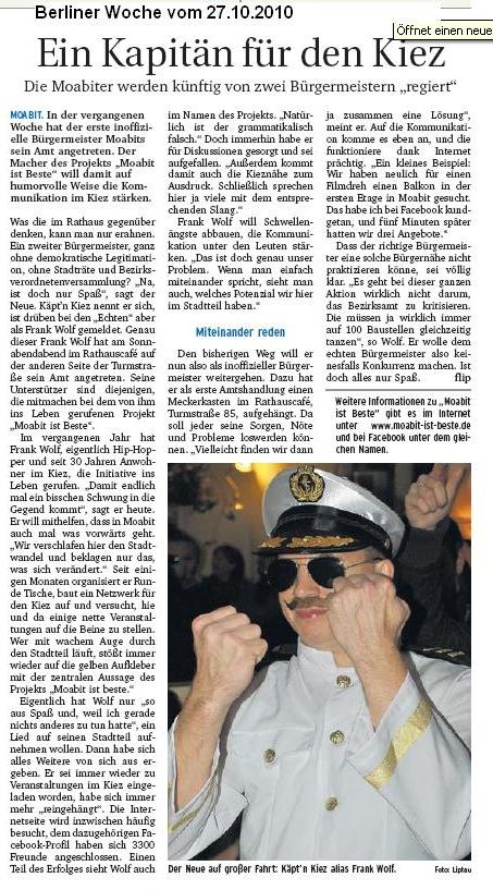 Berliner Woche vom 27.10.10 Ein Kapitän für den Kiez, Berliner Abendblatt vom 23.10.10 Ein neuer Bürgermeister für Moabit und die Fotos auf Moabit-ist-Beste.