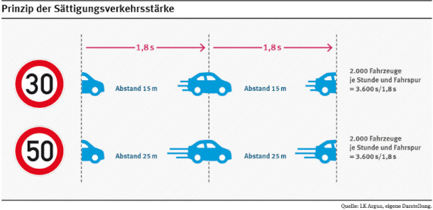Interessant fand ich in Bezug auf die gwünschte Leistungsfähigkeit einer Hauptverkehrsstraße die sogenannte Sättigungsverkehrsstärke. Bei höherer Geschwindigkeit sind größere Abstände notwendig, sodass letztendlich die gleiche Anzahl an Fahrzeugen unterwegs sein können, wie dieses Schaubild gut erklärt: