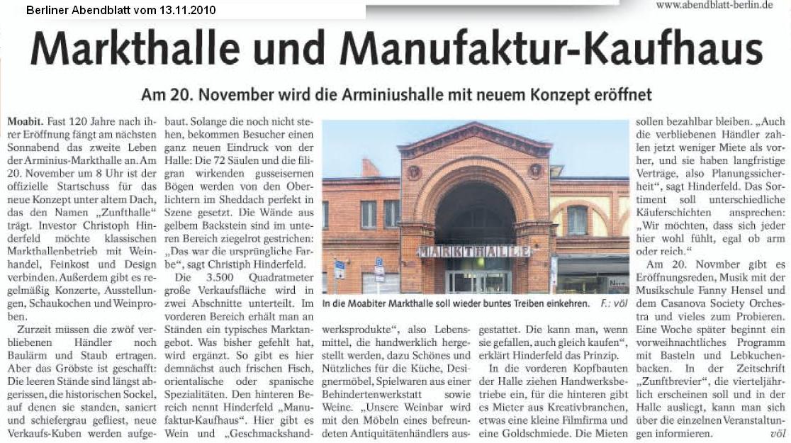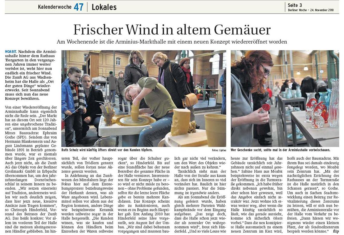 Am 20. November wurde die 120 Jahre alte Arminiusmarkthalle als Zunfthalle neu eröffnet. Viele Berlinerinnen und Berliner strömten massenhaft herbei und wuselten um die Stände, unter ihnen langjährige Stammkunden und Neugierige aus anderen Bezirken. Sämtliche Mitarbeiterinnen und Mitarbeiter hatten alle Hände voll zu tun. Im Programm wechselten sich feierliche Eröffnungsreden und Musik ab. Für die gute Stimmung sorgte das Saxophon-Quartett der Musikschule Fanny Hensel und das Casanova Society Orchestra. Auf der Fläche des Manufakturenkaufhauses waren viele schöne Dinge aufgebaut: Porzellan, Liköre, Spezialitäten, Bücher, Kaffee, Seifen, Weine aus Deutschland, Österreich und Ungarn, Schmuck und Souvenirs aus Moabit wie auch Möbel. Man konnte zuschauen wie sich auf einer Töpferscheibe unter kunstfertigen Händen Tonklumpen in Becher verwandelten. Am Abend wurden mehr als 300 geladene Gäste bunt gemischt aus Anbietern und Geschäftsfreunden der neuen Betreiber sowie Moabiterinnen und Moabitern großzügig bewirtet. Musik, Tango- und Kochvorführung des Fernsehkochs Chakall rundeten neben interessanten Gesprächen mit Bekannten und Unbekannten das Programm ab.
