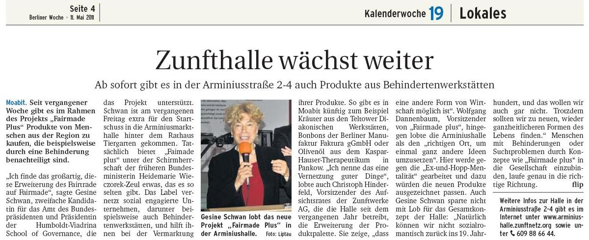 Über die Vorstellung des neuen "fairmade plus" Labels, unter dem Produkte von sozial orientierten Unternehmen, zum Beispiel von Behindertenwerkstätten angeboten werden, zu der Gesine Schwan gekommen war, hat das QM Moabit West berichtet und die Berliner Woche.