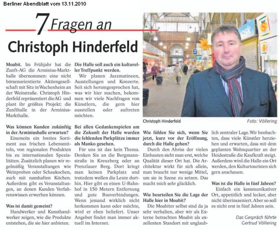 Seit 1. August 2010 hatte die Zunft[orte] AG, eine Tochtergesellschaft der Zunft AG die Arminiusmarkthalle in Erbpacht auf 50 Jahre von der Berliner Großmarkt GmbH übernommen. Danach war eine Menge zu tun. Die Trödler als Zwischennutzer wurden gekündigt. Mit den angestammten Händlern der Halle wurde über die Konditionen verhandelt. Die meisten konnten bleiben. Sie mussten zwar in neu gebaute Stände investieren, doch sind die Standgebühren sogar gesunken. Wer fehlt ist Nermin Dogan mit ihrem Fischhandel und der Eiermann, der nicht an einen anderen Platz umziehen wollte. Schade, aber nicht zu ändern. Das Hallenbrevier vom Herbst 2010 listet alle alten und neuen Händler und beschreibt ihre jeweiligen Angebote (download). Die anfängliche Skepsis vieler Moabiter, ob das Konzept der Zunft AG für die Arminiusmarkthalle sich als tragfähig herausstellen wird, wich zunehmender Zustimmung und sogar Begeisterung über die Einbeziehung der Menschen vor Ort, die so von einem auswärtigen Investor nicht zu erwarten war.
