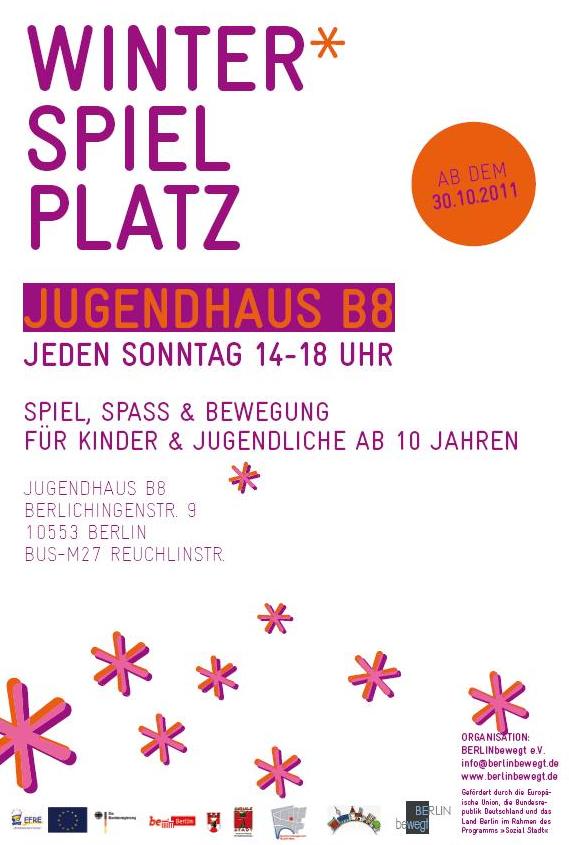 Ab dem 15. November ist jeden Sonntag von 14 bis 17 Uhr für Kinder und Jugendliche ab 6 Jahren das Jugendhaus B 8 als Winterspielplatz geöffnet. Möglich wird das durch Unterstützung von BERLINbewegt und der Techniker Krankenkasse.