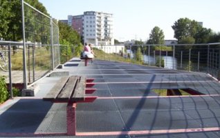 Im Frühling ist es mir zum ersten Mal aufgefallen, dass der Zugang zur dreieckigen Plattform an der Promenade entlang des Berlin-Spandauer-Schifffahrtskanal abgesperrt ist. Warum? O.k. die Sicherheit! Ein etwa 1 Meter mal 1 Meter großes Quadrat ist aus dem Metallgitter, aus dem die Plattform besteht, verschwunden. Dort klafft ein Loch. Außerdem fehlt an einer der vier Bänke ein Holzbrett, an zwei weiteren Bänken sind ein paar Bretter schadhaft. Also Bauzaun aufstellen. Fertig!