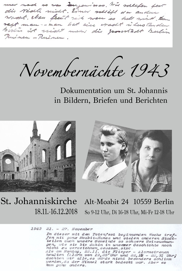 »Ich dachte, ich ersticke, so ein Rauch. Manche Straßen konnte man nicht passieren, da die Häuser einstürzten. Am 22.11.43 ist das passiert (...)« Bis auf Heilige Geist überstand keine der Moabiter Kirchen diesen nächtlichen Luftangriff. Und auch Malwina und Sylva Kloss überlebten nicht. Mutter und Tochter aus der Emdener Straße 47b, wurden in der darauffolgenden Nacht in ihrem Haus verschüttet und starben mit vielen Nachbarn unter den Trümmern. Die jetzt gefundenen Briefe an Verwandte geben einen kleinen Einblick in ihre damalige Gefühls- und Lebenswelt: Angst, Hoffnung, Freude, Trauer, Zuversicht und Glaube.