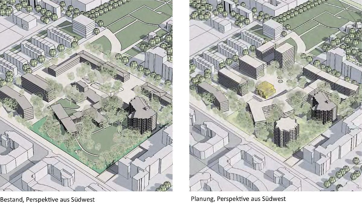 Eine perspektivische Visualisierung aus dem Masterplan zeigt die langfristig beabsichtigte erhebliche Verdichtung auf das 2,35-fache der Geschossflächenzahl (GFZ) gegenüber dem Bestand. Als Zeitraum der langfristigen Perspektive werden 45 Jahre genannt.