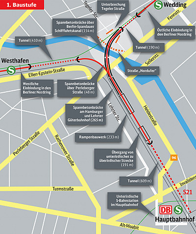 Information auf der Seite der Senatsverwaltung: Anschluss Hauptbahnhof S-Bahn-Linie 21, mit Detail-Fragen und Antworten, z.B. zum S-Bahnhof Perleberger Brücke.