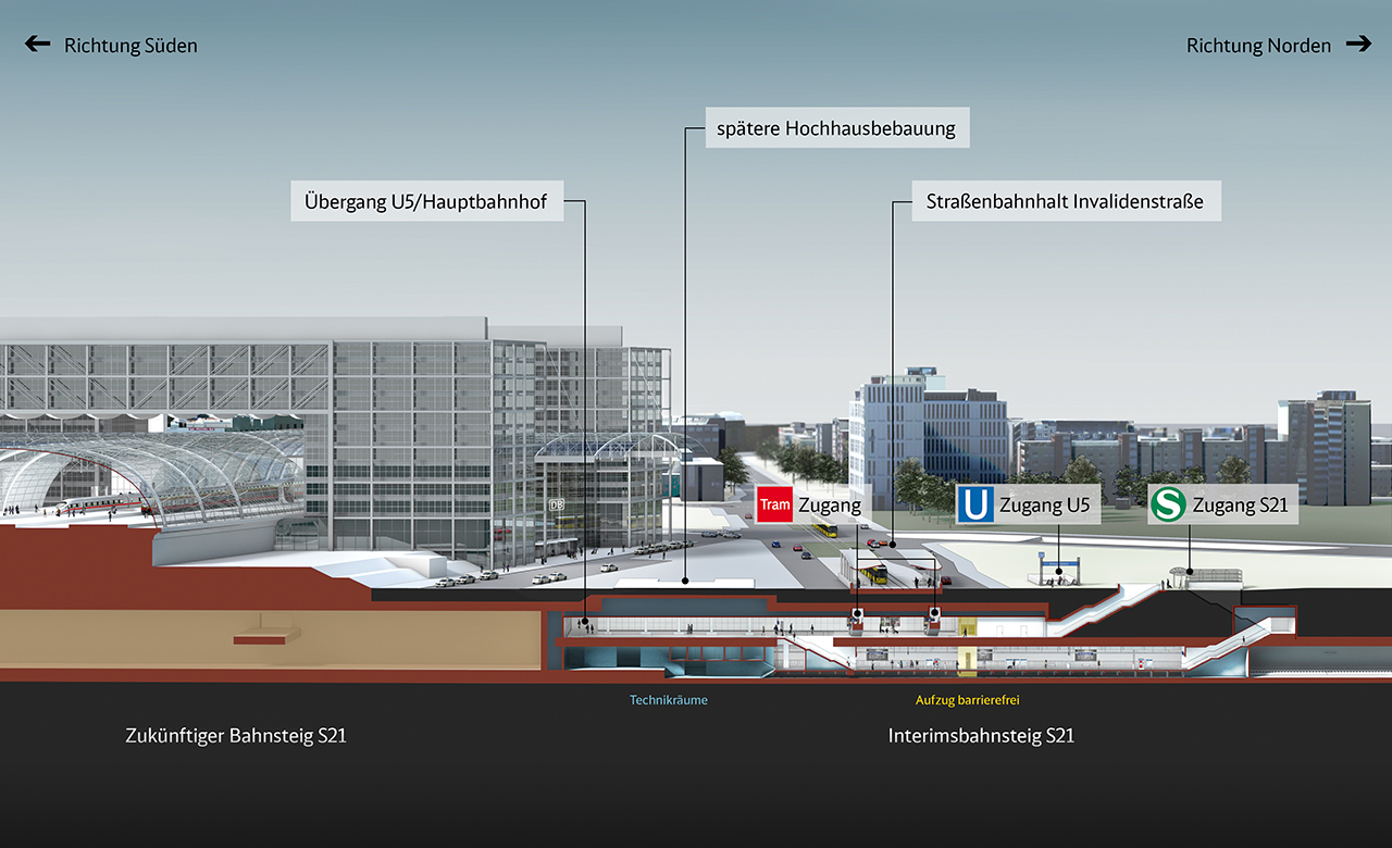 Eine Informationsseite zu Bauprojekten der Deutschen Bahn zum Bauprojekt S-Bahn Berlin S21 zeigt in einer Visualisierung die Lage des S21-Interimsbahnsteigs (es handelt sich um einen verkürzten Bahnsteig der nur für Kurzzüge geeignet ist) und des zukünftigen Bahnsteigs der S21 als Bestandteil des Hauptbahnhofs. Für den „richtigen“ S21-Bahnsteig entsteht aktuell am Europaplatz/Friedrich-List Ufer eine offene Baugrube. Dafür müssen ein Teil des Treppenaufgangs vom Europaplatz zum Bahnhof und die davor befindlichen Fahrradständer weichen.