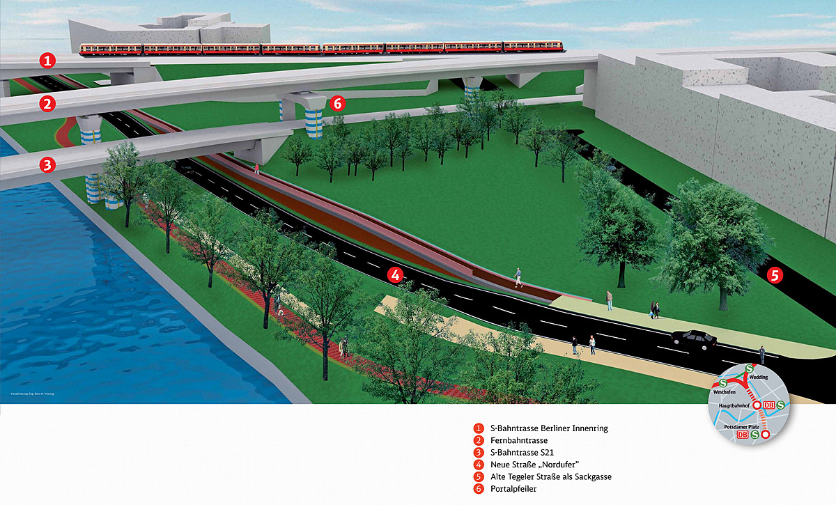 Da die Tegeler Straße wegen des S-Bahn Baus beiderseits des Nordrings zur Sackgasse wird, wird als Ersatz für den Autoverkehr die bisherige Sackgasse Nordufer unter den Brückenbauwerken hinweg – damit Lkw und Busse die künftige Straße nutzen können, muss diese unter der neuen S-Bahn-Brücke "tiefergelegt" werden - und weiter bis zur Einmündung der Tegeler Straße in die Fennstraße gebaut werden. Noch in diesem Jahr beginnen für den Straßen- und Brückenneubau dort die Rodungsarbeiten an der Vegetation, im Frühjahr 2013 wird es mit den Bauarbeiten losgehen. Die Tegeler Straße wird erst zur Sackgasse werden, wenn das neue Nordufer fertiggestellt ist.