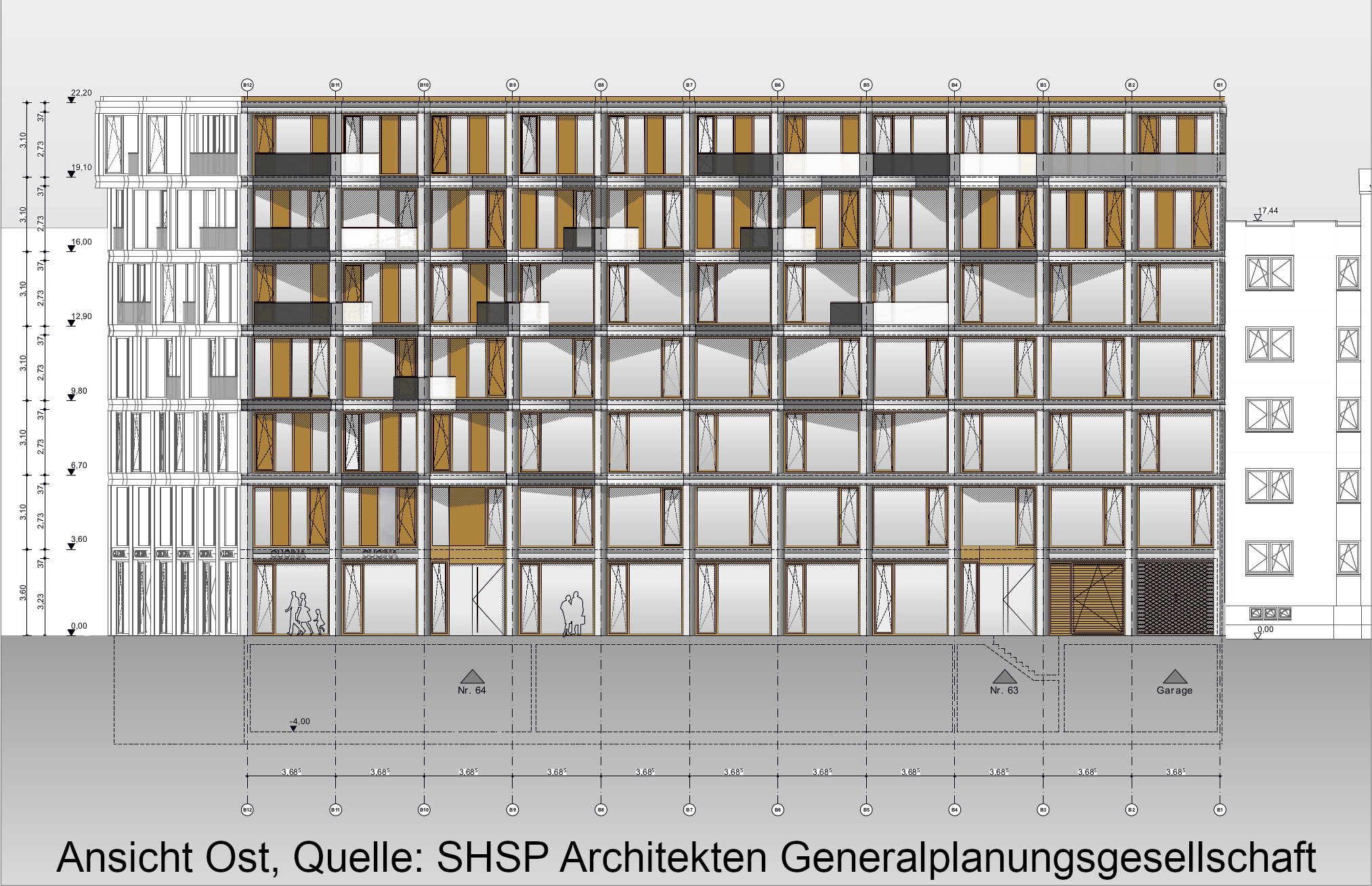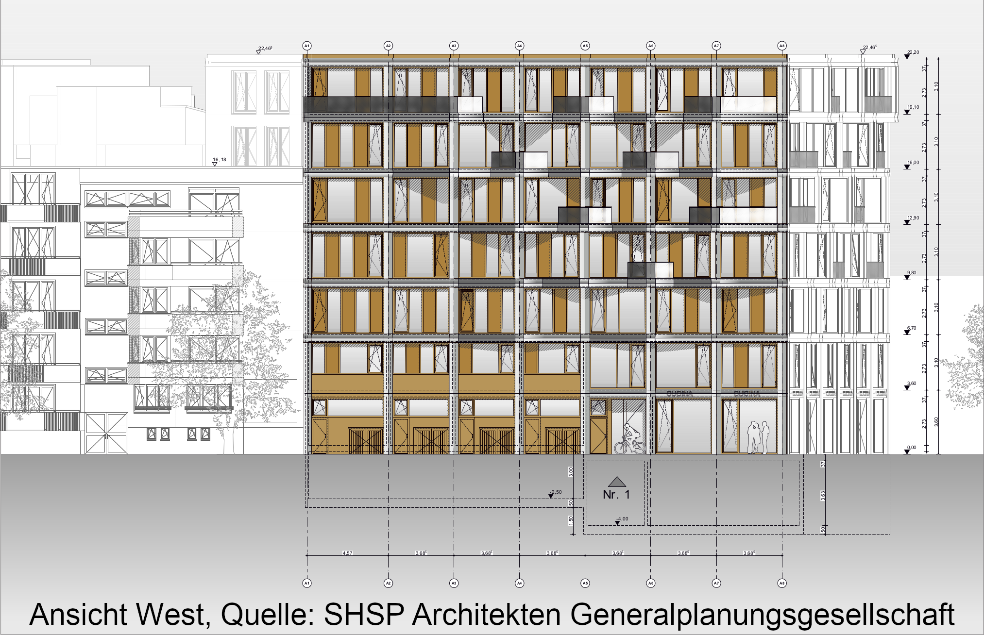 Vorgesehen ist eine Mischnutzung von 30 % Gewerbe und ca. 70 % Wohnen. Die Geschosszahl des Neubaus wurde gegenüber der Planung im Exposé vom Sommer 2019 auf 7 Stockwerke reduziert. Bei den Wohnungen soll es sich ausschließlich um Mietwohnungen handeln, von denen etwa 10 % mietpreisgebunden sein werden. An der zur Kreuzungsecke gewandten Kopfseite des Gebäudes wird planungsrechtlich eine gastronomische Nutzung im Erdgeschoss ermöglicht. Abstellmöglichkeiten für Fahrräder und Autos werden im Keller untergebracht, wobei für die Autos ein automatisches Pkw-Parksystem für 16 Stellplätze geplant ist. Mit dem Bebaungsplan werden Festsetzungen zum zulässigen Maß der baulichen Nutzung, den zu begrünenden Flächen und den Tiefgaragenstellplätzen getroffen. Zu dem Bebauungsplan wird ein Durchführungsvertrag nach § 12 Abs. 1 BauGB mit weiteren planerischen Zielsetzungen geschlossen. Konkrete Festlegungen sind den im Internet bereitgestellten Unterlagen nicht zu entnehmen, auch fehlen zum gegenwärtigen Zeitpunkt Unterlagen z.B. zu Umweltbelastungen. Auch ist anscheinend der Umgang mit dem öffentlichen Platz zur Kreuzung hin ungeklärt.