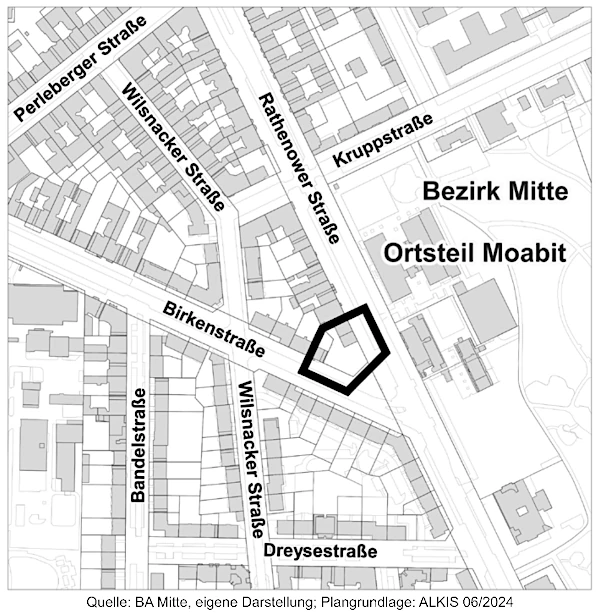 Das Gewerbegebäude Rathenower Straße 63, in dem sich derzeit noch die Autowerkstatt befindet und das nördlich angrenzende Gebäude und mit dem Werkstattsgebäude funktional verbunde Gebäude Rathenower Straße 64 - neben Gewerbe sind dort auch Wohnungen, werden abgerissen. Die Neubebauung orientiert sich sich vom Grundstück her an der Grundform der Bebauung vor 1945 mit einer Kopfseite des Gebäudes hin zu einem öffentlichen Platz bis zur Kreuzungsecke. Durch das Bauvorhaben wird die Blockrandbebauung geschlossen und die Straßenzusammenführung Birkenstraße Ecke Rathenower Straße räumlich gefasst.