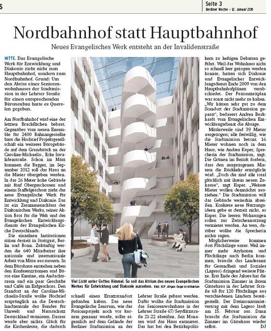 Der Bau des "Evangelischen Zentrums für Entwicklung und Diakonie" von Diakonischem Werk und Evangelischem Entwicklungsdienst (EED) auf dem Gelände der Berliner Stadtmission ist abgesagt. Dies gaben am 4.11.2010 die Vorstände der beteiligten Organisationen in einer gemeinsamen Presseerklärung bekannt. "Die engen zeitlichen Erfordernisse sind nach unserer Einschätzung in der Lehrter Straße nicht realistisch umzusetzen" erkärte dazu der Vorstand des Diakonischen Werks, Vizepräsident Dr. Wolfgang Teske. Diakonie und EED halten aber am Zeitplan der Fusion der beiden Werke der Evangelischen Kirche Deutschlands fest. Die Fusion des früher unabhängigen Werks "Brot für die Welt" in die Diakonie ist zwischenzeitlich erfolgt. Die Mitarbeiter der bisher in Stuttgart, Bonn und Berlin ansässigen Organisationen mit aktuell 640 Beschäftigten sollten nach den bisherigen Plänen in einem Büroneubau samt Tagungszentrum auf dem Gelände der Berliner Stadtmission untergebracht werden. Wegen aufgetretener Schwierigkeiten hatte die Diakonie zwischenzeitlich nach Alternativen gesucht. Diakonie-Vizepräsident Teske und Tilman Henke, Vorstand des EED geben sich zuversichtlich, am Berliner Immobilienmarkt zeitnah Alternativen für das Projekt zu finden, die die fristgerechte Fertigstellung des "Evangelischem Zentrums" gewährleisten. Unter Mitarbeitern der Kirchenwerke kreisen Gerüchte zu einem Standort im Ortsteil Mitte.