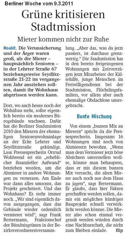 Viele der Senioren sind in die Lehrter Straße 69 A umgesetzt worden. Zum Jahreswechsel wurde die Verwaltung des bezirkseigenen Mietshauses an die Berliner Stadtmission abgegeben. Seit dem können die Senioren ihren Gemeinschaftsraum nicht mehr nutzen. Sie mussten ihre Schlüssel abgeben. Die Berliner Woche fragt: Wo bleibt die Nächstenliebe? Zu deiesem Thema gibt es auch eine mündliche Anfrage (Drs. 2031/III) in der BVV am 17.2.2011.