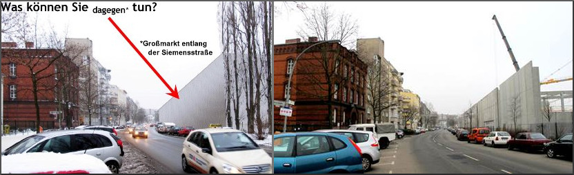 Seinerzeit hatten wir – die BI Siemensstraße – auf das Vorhaben eines Münchner Investors aufmerksam gemacht, gemahnt, argumentiert, Verbesserungsvorschläge unterbreitet, Unterschriften gesammelt – nicht gegen einen Großmarkt an sich sondern für eine menschenwürdige Architektur, wohngebietsachtenden, abstandhaltenden, behutsamen, stadtteilgerechten Städtebau.