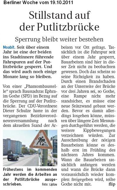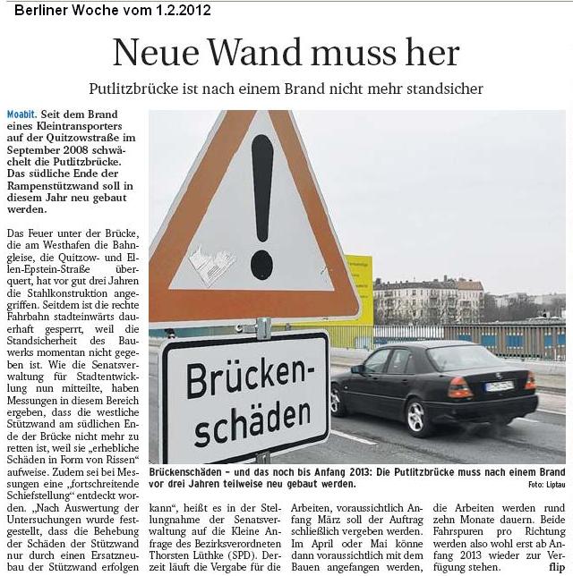 Am 18. Juni 2012 beginnt laut Mitteilung der Senatsverwaltung für Stadtentwicklung die Sanierung der bei einem Fahrzeugbrand im September 2008 beschädigten Putlitzbrücke. Etwa 1 Jahr werden die Bauarbeiten dauern, die Kosten betragen ca. 920.000 €. Für die dauerhafte Behebung der Schäden ist ein Neubau der Stützwand an der Putlitzstraße erforderlich. Dieser Ersatzneubau der Rampenstützwand umfasst den Abriss der vorhandenen Stützwand einschließlich des Rückbaus der vor der Stützwand befindlichen Pflanztröge. Dabei müssen Versorgungsleitungen gesichert werden. Danach erfolgt der Neubau der Winkelstützwand. Da der Neubau der Stützwand unter Vollsperrung der beiden westlichen Fahrbahnen auf der Brücke durchgeführt wird, ist die Putlitzbrücke für ca. ein Jahr nur einspurig befahrbar.