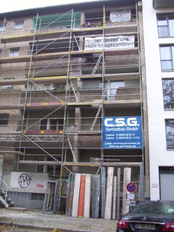 Am Freitag, den 14. November 2014, begann aus heiterem Himmel der Abbau des Gerüsts und der Bauplanen an der Calvinstraße 21. Die sechs Mietparteien freuen sich, steckten sie doch seit Juni 2013 unter diesen Planen und haben nach fast anderthalb Jahren endlich wieder freie Sicht nach draußen.
