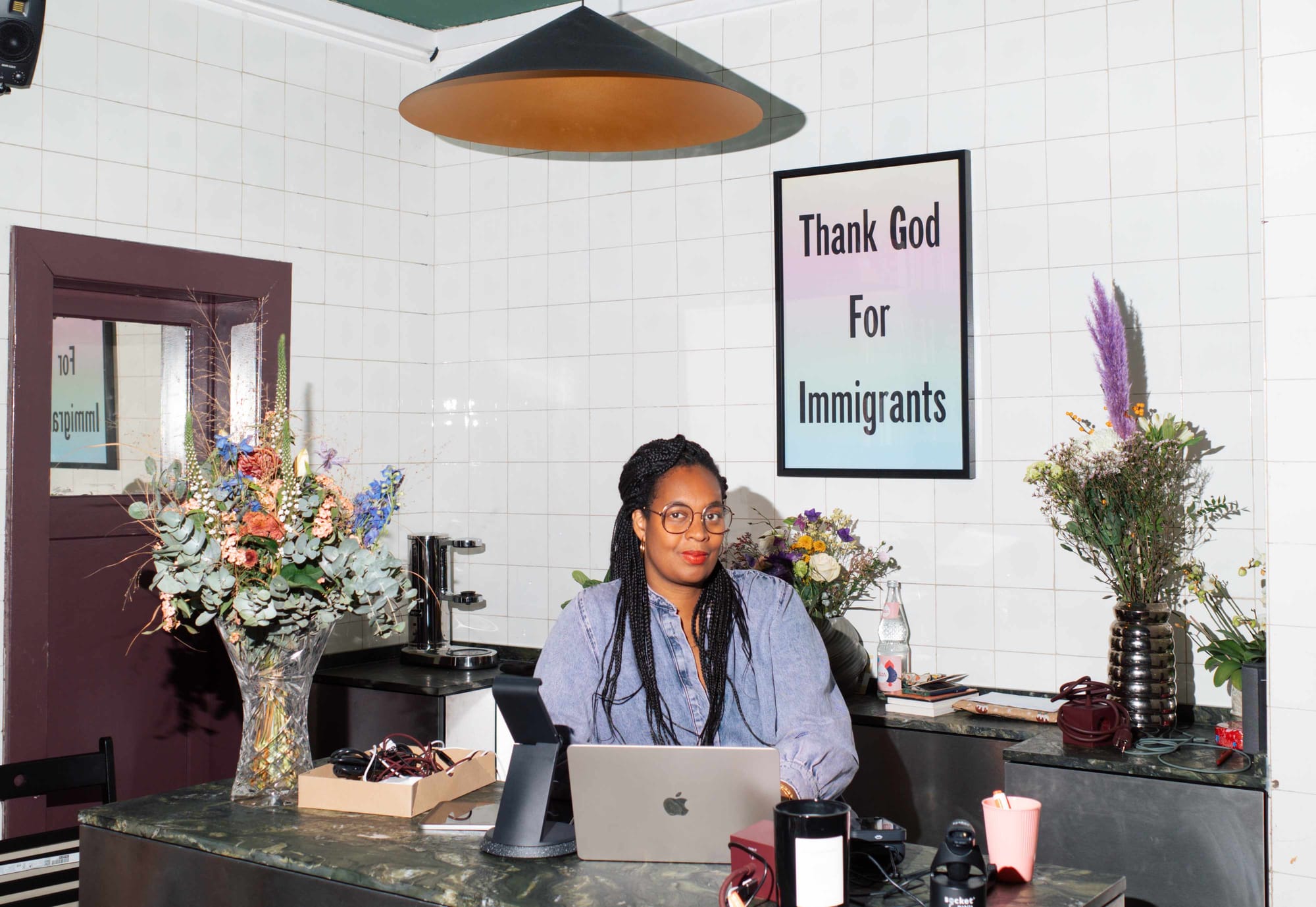 Als ich Sharmaine Lovegrove zum Interview treffe, ist ihre neue Buchhandlung Chapters in der Wilsnacker Straße 60 noch gar nicht offiziell eröffnet. Sie begrüßt mich mit einer Umarmung und ruft: "Ich muss ein Foto von dir machen! Du trägst die 'Chapters‘-Farben!" Die Wände sind wie mein Kleid dunkelgrün und sowohl meine Jacke als auch die Türen im Laden sind weinrot. Alles natürlich reiner Zufall, aber die Stimmung ist direkt ausgelassen.