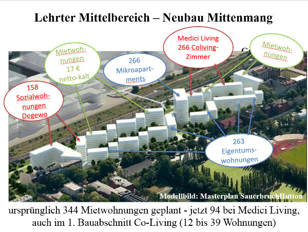 Diese Mikro-Apartments waren von vorneherein eingeplant beim Mix mit leider nur 158 Sozialwohnungen im nördlichen Teil, 263 Eigentumswohnungen an der Lehrter Straße und 344 frei finanzierten Mietwohnungen an der Klara-Franke-Straße und der Bahnstrecke. Doch jetzt sollen zu den Mikro-Apartments noch 266 Co-Living-Zimmer hinzukommen.