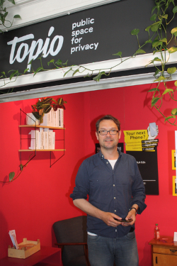 Michael Wirths verabschiedet kurz einen Kollegen und empfängt mit einem Lachen im Gesicht. Wir sitzen zum Interview in Sesseln, denn es gibt eine gemütliche Abteilung in dem Markstand, an dem früher Comics gehandelt wurden. Der Stand wirkt offen und einladend, so dass man sich ohne Berührungsängste hier niederlassen und wohlfühlen kann. Er befindet sich ganz hinten in der Reihe vom Imbissstand „Drei Damen vom Grill“ und wird vom Topio e.V. betrieben. Topio wirbt mit „public space for privacy“, auf Deutsch: Öffentlicher Raum für Privatheit. Doch zunächst zu Michael, der aus Freiburg stammt und seit 2001 in Berlin lebt. Der Aktivist für mehr Datenschutz und Privatsphäre auf Endgeräten wohnte erst in Kreuzberg und Prenzlauer Berg, bevor er 2009 nach Moabit zog. Von Beruf ist er Grafik- und Web-Designer, gründete 2006 eine Werbeagentur und arbeitet vor allem im Bildungsbereich. Als Mitbegründer und Vorstand des Topio e.V. engagiert er sich für „unsere Grundrechte im digitalen Zeitalter“, denn