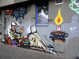 auf seine Bücher und im Klo.