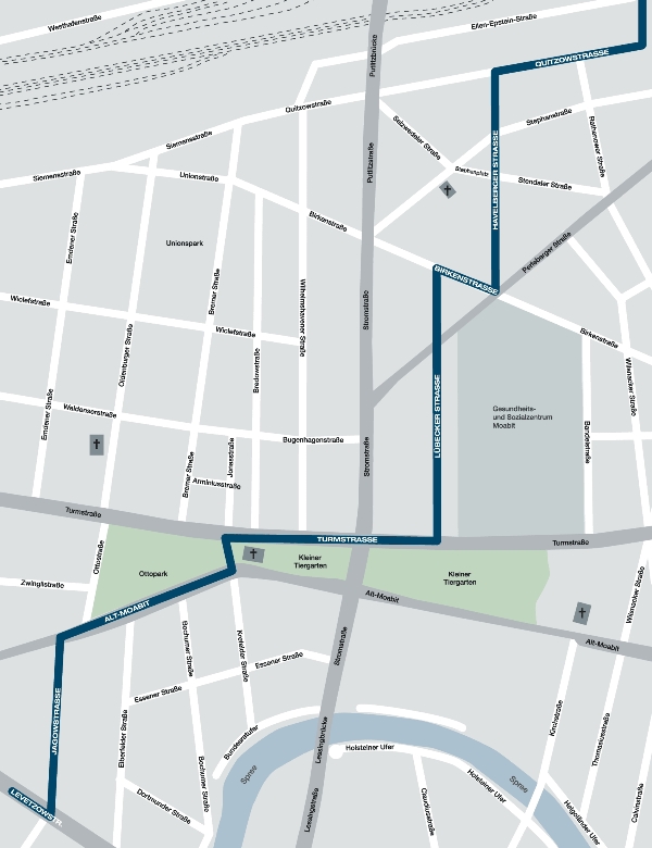 ging für mehr als 30.000 Tausende** von insgesamt 50.000 deportierten jüdischen Berlinern - Frauen, Männern und Kindern – über eine Strecke von etwa 2,5 km quer durch Moabit. Nicht bei Nacht und Nebel sondern am hellichten Tag wurden sie in großen Gruppen über Jagowstraße – Alt-Moabit – Thusnelda-Allee, vorbei an der Heilandskirche und weiter über die Turmstraße, Lübecker Straße, Birkenstraße, Havelberger Straße zur Quitzowstraße getrieben, wo zwischen Lidl und Hellweg ein schmaler Weg, der noch mit dem alten Kopfsteinpflaster belegt ist, zu einem kurzen Stück der verbliebenen Rampe des Güterbahnhofs Moabit führt. Und fast niemand wollte etwas gesehen haben.