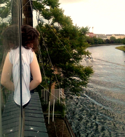 In Moabit und auf dem Areal des Moabiter Spreelofts fühle er sich sehr wohl, zumal die Lage direkt am Wasser den Ort einzigartig mache. „Der Fluss ist sehr inspirierend fürs Arbeiten und gut zum Entspannen. Man kann von der Hektik der Stadt Abstand nehmen und abschalten und hat viel Licht und Sonne.“ Alexei deutet auf die Wände gegenüber der breiten Fensterfront: „An der Decke entstehen Lichtspiele, verursacht durch die Reflexionen der Sonne auf dem Wasser.“ Ans Fenster gelehnt, werfe ich einen prüfenden Blick hinab in die Tiefe, die sich mir glitzernd und funkelnd, mit kleinen Wellen und Schaumkronen präsentiert. Beinahe fühle ich mich wie an Bord einer Fähre und frage mich, ob es wohl möglich sei, der schnellen Strömung der Spree und ihrer Verzweigung in weitere Wasserstraßen bis hin zu ihrer Mündung ins Meer zu folgen und weiter auf dem Seeweg bis zur Namensgeberin des Artspaces, der großen Kunst- und Kulturmetropole Petersburg, zu gelangen …