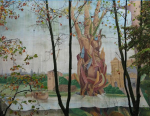 Versteckt hinter Bäumen und etwas verblasst befindet sich in der Pritzwalker Straße 16 in Moabit an der Seitenwand eines Hauses ein Wandbild. Auf ihm ist eine historische Stadtlandschaft zu sehen, die von einem merkwürdigen Baum dominiert wird. Statt eine Werbebotschaft zu verkünden, wie viele seiner aktuellen Kollegen, oder im grellen Graffitistyle einen Schriftzug oder ein abstraktes Muster darzustellen, ist hier erst einmal unklar, was für eine Botschaft vermittelt werden soll. Es bedarf ein wenig Recherche, um herauszufinden, was es mit dem Wandbild auf sich hat. Das hat auch damit zu tun, dass es schon so lange hier ist: nämlich seit 1979! Wenn man sich überlegt, wie viele Relikte aus der DDR seit der Wende verschwunden sind, ist es wirklich erstaunlich, dass sich dieses Wandbild so lange halten konnte. Manchmal muss halt erst jemand von weit herkommen, um den Blick auf das Naheliegende zu werfen – wie in diesem Fall die US-Amerikanerin Emily Moore, die ihre Abschlussarbeit an der University Boston/Wellesley über die Künstlergruppe Ratgeb geschrieben hat. Bei einer Veranstaltung im Friedrichshain-Kreuzberg Museum stellt sie ihre Recherchen vor und erklärt, dass es sich um das erste Wandbild der Künstlergruppe handelt und um das zweite Wandgemälde überhaupt, das in West-Berlin seit der Wanddekorationskunst der Belle Epoque entstanden ist.