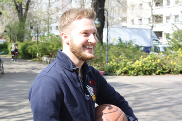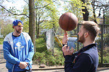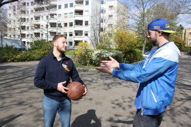 Normalerweise, also wenn kein Corona herrscht, trainiert Max zwei Mal pro Woche bei den Lions, nach der Jugendmannschaft inzwischen in der Herrenmannschaft. Am Wochenende ist dann meist ein Spiel. Derzeit darf in den Sporthallen ja kein Basketball gespielt werden und so kommt es, dass einer der Lions-Trainer allen Interessierten - frei für die Öffentlichkeit - regelmäßig online per Zoom einige Übungen zum Mitmachen zeigt. Dabei geht es vor allem um Kardiotraining, aber auch mit Springseilen und Bällen wird geübt. Dabei kann man leicht an seine Grenzen kommen, denn „wenn man die ganze Zeit mit dem Basketball zuhause in der Wohnung dribbelt, kann das die Nachbarn stören.“ So bald die Temperaturen draußen weiter steigen, kann in den Altersklassen bis 14 Jahre mit maximal fünf Kindern pro Übungsleiter trainiert werden. Für alle Älteren bietet der Verein die Möglichkeit für Individualtrainings an. Dieses Angebot bekannter zu machen und vor allem mehr Kinder zum Sporttreiben zu ermutigen, gehört u.a. zu den Aufgaben von Max als Kiezkoordinator. Er trifft sich gern mit Interessierten zu einem Individualtraining. „Das muss gar nicht immer Basketball sein, wir können auch zusammen Tischtennis oder Fußball spielen.“