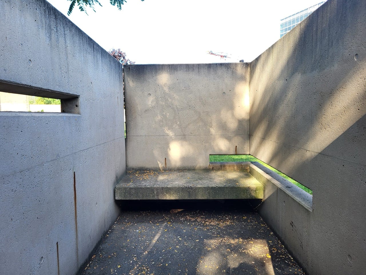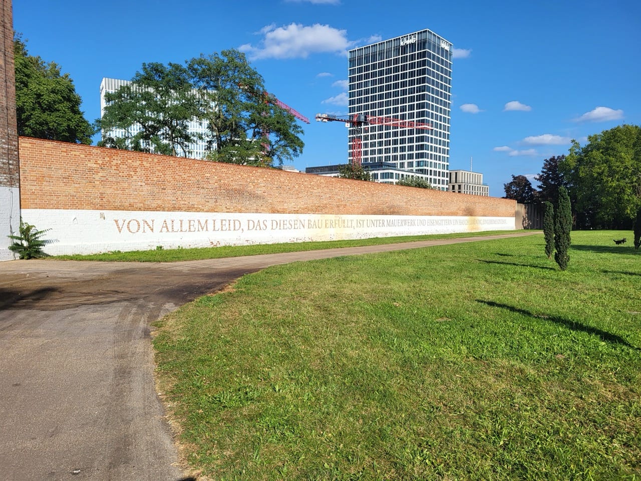 Ich sehe mir noch die denkmalgeschützten Mauern und einige der erhaltenen Konstruktionen im Park an. „Von allem Leid, das diesen Bau erfüllt, ist unter Mauerwerk und Eisengittern ein Hauch lebendig, ein geheimes Zittern…“, steht an einer der Wände geschrieben, ein Zitat aus den „Moabiter Sonetten“. Die hat der NS-Widerstandskämpfer (und zuvor Günstling von Rudolf Heß) Albrecht Haushofer geschrieben, als er hier inhaftiert war – und bevor er noch im April 1945 hingerichtet wurde Eindrucksvoller noch als die vor dem Park platzierten Gedenktafeln weist dieser Schriftzug auf das Elend hin, das an diesem Ort einst herrschte. Und so fällt es mir schwer, die Leere und Ruhe hier wirklich zu genießen. Es gelingt mir trotzdem für einige Momente, bevor ich mich wieder hinauswage, in den Lärm und das Getümmel auf der Invalidenstraße.