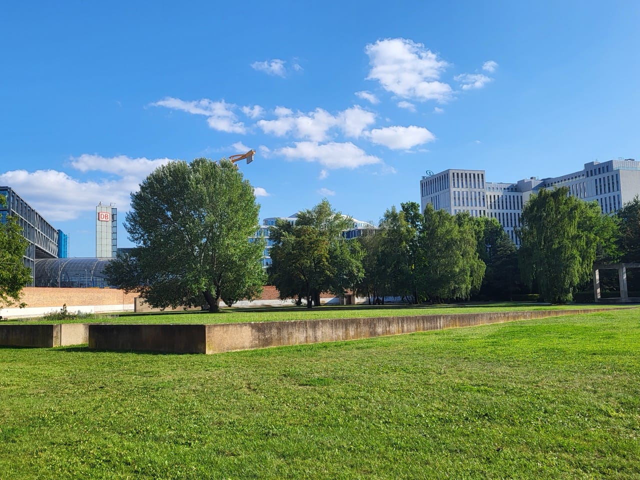 Obwohl ich mitten in Berlin bin, sind hier kaum Menschen und nicht einmal der Straßenlärm stört. . Eine Gruppe Männer sitzt auf einer Grünfläche, ein älterer Herr sitzt auf einer Bank, eine Dame schiebt ihr Rad durch den Park. Später kommt noch ein junges Pärchen, aber viel mehr ist hier nicht los. Das kenne ich aus Berliner Parks bei 25 Grad an einem Samstag sonst anders.