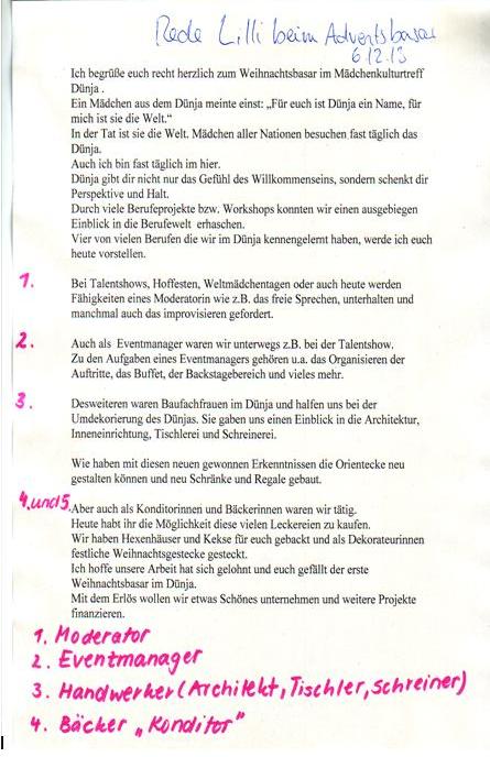 Der Winter kündigt sich an, als ich die Jagowstraße entlang laufe. Es weht ein kalter Wind und es ist jetzt, kurz nach 16 Uhr, schon dunkel. Aus dem Haus Nr. 12 dringt Licht nach draußen, ich höre Stimmengewirr von drinnen. Ich bin gespannt was mich erwartet. Als ich eintrete, empfängt mich geselliges Treiben und dezente Weihnachtsmusik. „Oh, wie schön“, denke ich und sehe mich um. Ein Banner mit der Aufschrift „Adventsbasar“ spannt sich in rot und grün quer durch den Raum. Mir schießt durch den Kopf: „Das Dünja ist verzaubert.“ In der Tat hat die Vorweihnachtszeit Einzug gehalten. Heute, am 06. Dezember 2013, dem Nikolaustag, lädt der Mädchen-Kultur-Treff von 16 bis 19 Uhr zum fröhlichen Beisammen sein ein. Organisiert haben den Basar die Mädchen aus dem Projekt "Junge Moabiterinnen fit für den Berufseinstieg".