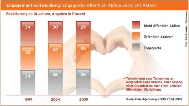 Das soziale Netz ist löchrig geworden, wenn auch im internationalen Vergleich noch gut ausgestattet. Städte und Kommunen leiden unter Finanznöten oder wie im Falle von Berlin, unter den ganz beträchtlichen Zinslasten der enormen Schulden. Öffentliche Aufgaben, von der Pflege der Grünanlagen bis zur Förderung von Einrichtungen, die sich um die Kinder, Jugendlichen und Senioren kümmern, werden zusammengestrichen. Daneben existieren zahllose Vereine und Gruppierungen, in denen sich Menschen ehrenamtlich engagieren. 2009 waren es immerhin 36 Prozent der Bevölkerung, die meist in Vereinen freiwillig und kostenlos mitarbeiten.