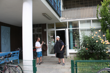 Barrierefreiheit wäre angesichts der vielen älteren Bewohner wichtig. Nicht nur in den Zimmern und Duschbereichen. Das bis in die 5. Etage belegte Gebäude hat leider keinen Fahrstuhl und ergänzend zu den drei Stufen zum Eingangsbereich wäre eine Rampe ganz praktisch. Was die Nachbarschaft angeht, haben bereits die Hausleitungen vor Marcus damit begonnen, das Haus zum Kiez hin zu öffnen. Seit 2011 ist das Wohnforum im Quartiersrat von Moabit-Ost als „Starker Partner“ präsent und konnte dabei mitwirken, dass z.B. eine Ausstellung zur Geschichte des Hauses organisiert wurde. Die Wohnungslosenunterkunft beteiligt sich am jährlichen Suppenfest und am Perlenkiezfest. Sie brachte die Broschüre „Wie das Leben so spielt“ mit den Lebensgeschichten von Wohnungslosen heraus und ist zudem eine Verleihstation für das Kiez-Kaffee-Fahrrad. Wer das kostenfrei ausleihen möchte, braucht nur das QM-Büro zu kontaktieren, und das gibt dann der Pforte in der Lübecker Straße Bescheid, wer zum Abholen kommt. Auch der Gruppenraum mit Platz für rund 15 Personen kann von externen Organisationen genutzt werden. Dort gab es schon Vorträge der Obdachlosen-Uni, und hier möchte sich, wenn es die Corona-Regeln wieder zulassen, sich die Seniorengruppe des Älterwerden-Projekts "Wir in Moabit" treffen. Marcus möchte die Idee des offenen Hauses in der Zeit nach Corona gern wiederbeleben und viele Aktivitäten zusammen mit der Nachbarschaft anleiern. Eine Idee, die noch in den Kinderschuhen steckt und durch die Pandemie-Einschränkungen zum Erliegen kam, sind Ehrenamtliche von draußen, die z.B. den Bewohnern und Bewohnerinnen beim Papierkram mit den Behörden helfen. Eine schöne Idee, die es weiter zu verfolgen gilt.