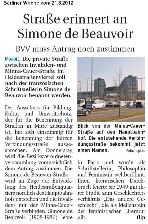 Im Frühjahr berichtete die Berliner Woche, dass eine kleine Straße am Hauptbahnhof, zwischen Invalidenstraße und Minna-Cauer-Straße gelegen, nach der Philosophin und Frauenrechtlerin Simone de Beauvoir benannt werden soll. Das klang gut. Sie wäre in guter Nachbarschaft gewesen, die französische neben der deutschen Frauenrechtlerin Minna Cauer, vereint mit den vielen bekannten und unbekannten Frauen, nach denen die neuen Straßen rund um den Hauptbahnhof benannt wurden. Der Bezirk Mitte hatte, wie auch der frühere Bezirk Tiergarten, schon vor Jahren einen Beschluss gefasst alle neuen Straßen nach Frauen zu benennen, bis das Geschlechterverhältnis der Straßennamen ausgeglichen ist, was vermutlich noch ziemlich lange dauern wird.
