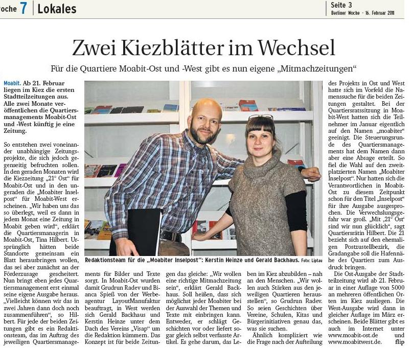 So kommt seit Februar alle zwei Monate die „21oOst“ im Quartiersmanagementgebiet Moabit-Ost heraus und seit März die „Moabiter Inselpost“ im Quartiersmanagementgebiet Moabit West. Das passt schon. Die Gebiete überschneiden sich nicht und in die öffentlichen Auslegestellen kommen die Zeitungen zweimonatlich im Wechsel. So haben die QM-Teams von Moabit West und Moabit-Ost es mit ihren Auftragnehmern abgesprochen. Für das QM Moabit-Ost gestaltet die Layoutmanufaktur mit Gudrun Radev und Bianka Spieß die Quartiers-Zeitung, für das QM Moabit West der neu gegründete Verein VISAP mit Kiezreporter West Gerald Backhaus und Kiezreporterin Ost Kerstin J. Heinze.