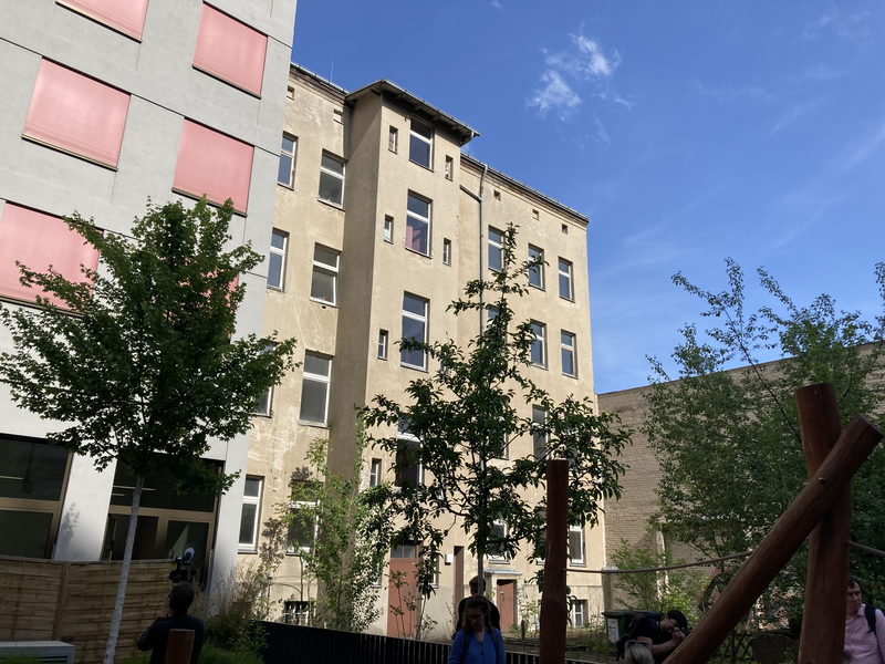 Auf rund 40 Hektar Fläche sollen in den Unternehmen, die sich in der Europacity ansiedeln, insgesamt mehr als 16.000 Arbeitsplätze entstehen. Rund 3.000 Wohnungen sind geplant, von denen viele schon bezogen wurden. Nur 257 Wohnungen der geplanten rund 3.000 Wohnungen sind vom Land Berlin geförderte Sozialwohnungen. Und ausgerechnet diese sind noch nicht fertig, wie die Künstlerin Nora Spiekermann beim Kiezspaziergang berichtete. Sie führte den Rundgang in den Hof des „Urban Loft Hotel“ der Althoff-Gruppe, das im August 2022 fertig gestellt wurde. Im Innenhof hat man einen Blick auf einen Kindergarten und die einzigen geförderten Sozialwohnungen im benachbarten Elfgeschosser namens „Quartier Heidestraße Spring“. Außerdem kann man vom Hotelhof hinüber schauen auf das alte Haus Heidestraße 45, das in der Gründerzeit gebaut wurde und leer steht. Der letzte verbliebene Mieter hatte dort ohne Heizung gelebt und den Garten gepflegt. Inzwischen ist er verstorben. Das Haus wurde nun mutmaßlich für 5,2 Mio. Euro verkauft. Es gehört zum Bundeseisenbahnvermögen, doch keine landeseigene Wohnungsgesellschaft wollte es ihr abkaufen. Es sei für die Gesellschaften wohl zu klein gewesen, vermutet Stadtrat Gothe. Das Haus Nr. 54 hingegen wurde von einem Künstler in die Stiftung „Haus Kunst Mitte“ überführt und dient nun als Kunstgalerie künstlerischen Zwecken - mehr www.hauskunstmitte.de .