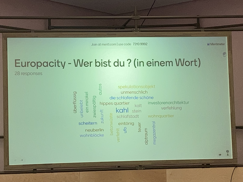 Darauf gab es 28 Antworten. Darunter waren diese Begriffe: Wohnquartier, Spekulationsobjekt, Investorenarchitektur, unmenschlich, teuer, Schlafstadt, eintönig, Ufo, Alptraum, megazentral, Verfehlung, Scheitern, Wohnblöcke, überflüssig, unbelebt, ein Mirakel, zwiespältig, hippes Quartier, Zukunft, Betonwüste, die schlafende Schöne, Schießscharten in den Fassaden, denn es geht ums Geld …