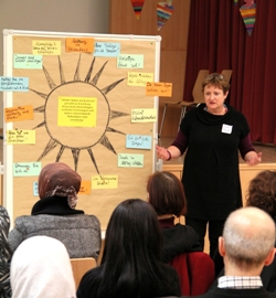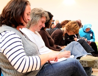 Umso erfrischender war die Vorstellung der themenzentrierten Elternabende und der Bericht über den ersten Abend zum "Thema Respekt in der Familie" beim Stadtteilplenum Moabit West. Dies Foto links zeigt schmunzelnde Gesichter. Das ist doch mal ein Unterschied. Im November waren Angelika Monath, eine erfahrene Kursleiterin von "Starke Eltern - starke Kinder" und die Erzieherin Yasemin Türkmen die Expertinnen.