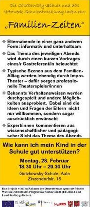 Der zweite themenzentrierte Elternabend mit Impro-Theater findet statt am 28. Februar 2011 von 18.30 Uhr bis 20.30 Uhr in der Aula der Gotzkowsky-Schule, Zinzendorfstr. 15, 10555 Berlin (Moabit). Alle interessierten Eltern sind herzlich eingeladen. Das Thema für diesen Abends haben die Eltern sich beim letzten Mal gewünscht: "Wie kann ich mein Kind in der Schule gut unterstützen?
