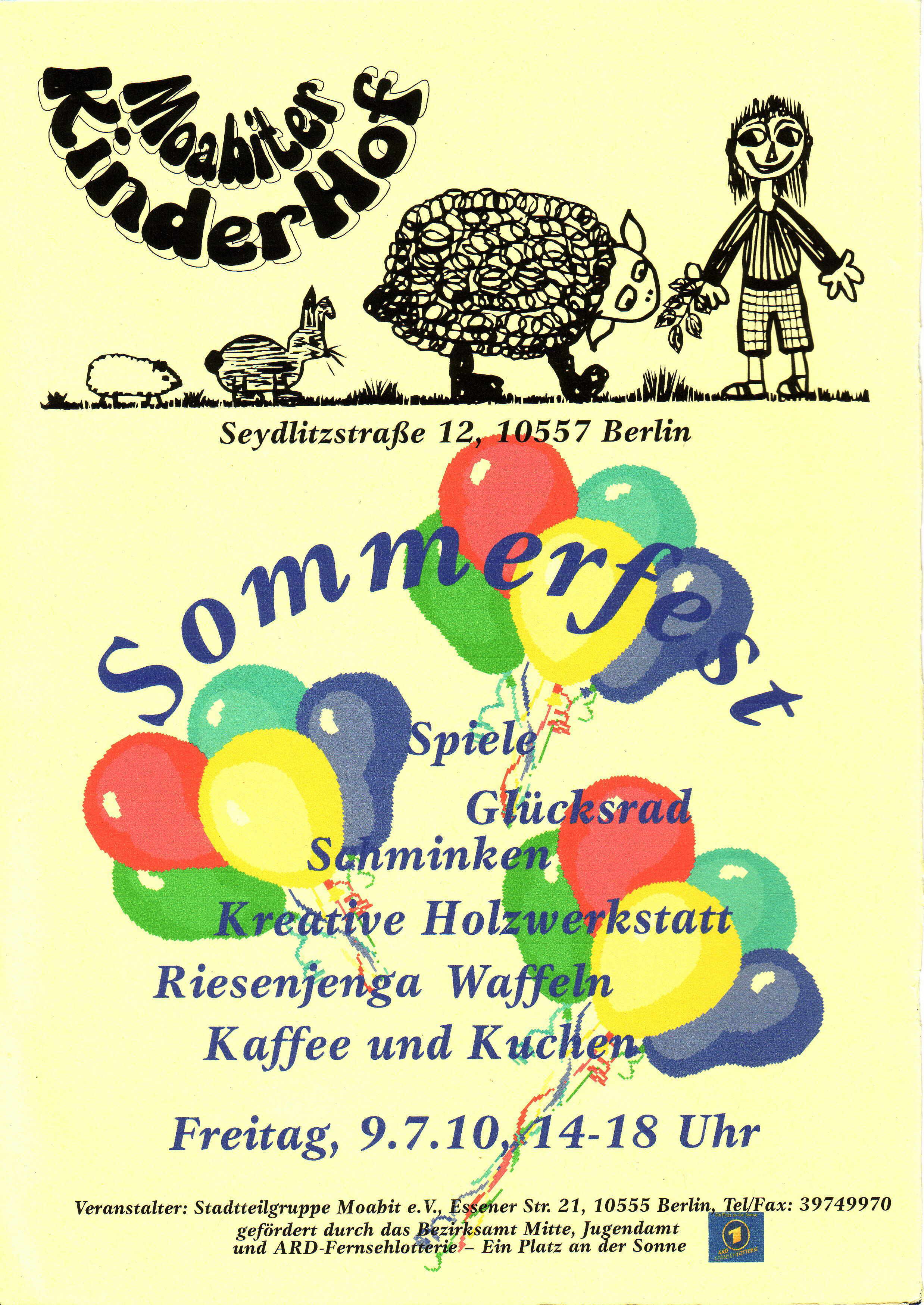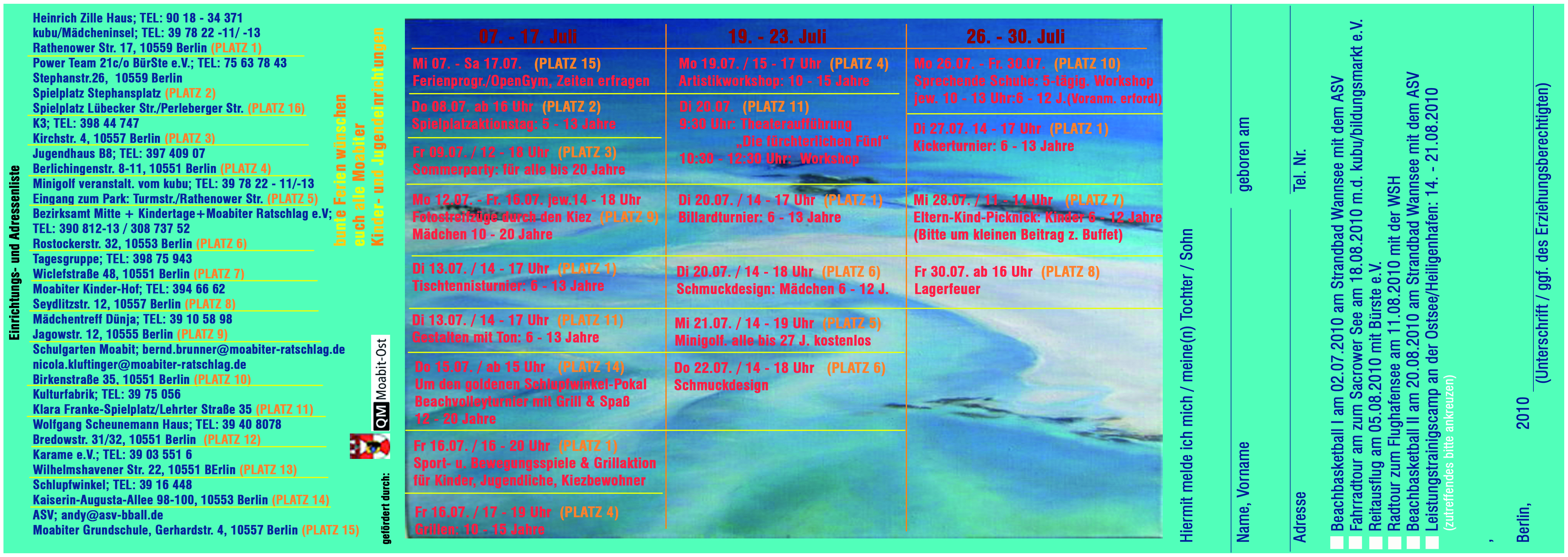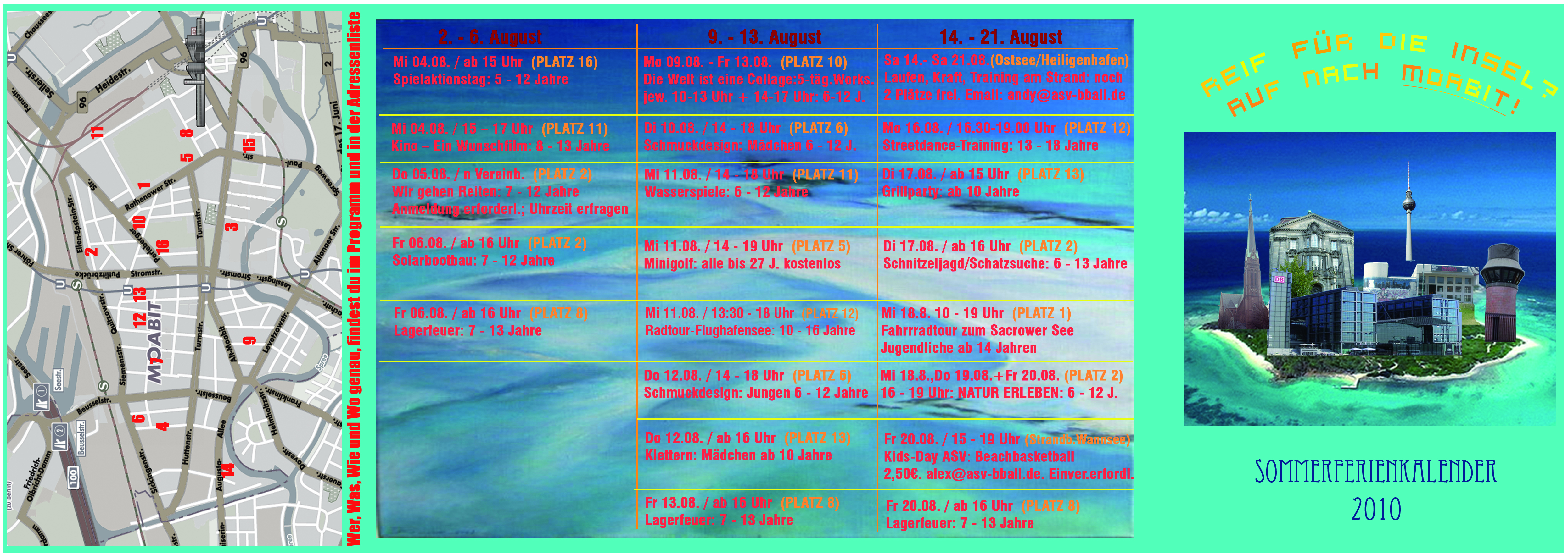 Außerdem haben sich 15 Kinder- und Jugendeinrichtungen, sowie ein Bürger- und Sportverein aus Moabit zusammengeschlossen und einen Programm-Flyer herausgegeben, der vom Quartiersmanagement Moabit-Ost gefördert wurde: Jede Menge Aktivitäten zu unterschiedlichen Zeiten an unterschiedlichen Orten in Moabi und auch einige Ausflüge nach außerhalb. Kino, Streetdance, Sport- und Bewegungsspiele, Artistik, Klettern, Schmuckdesign, Tischtennis-, Kicker-, Billiard- und Beachvolleyballturnier, Grillen oder Picknick mit Eltern, Lagerfeuer (mehrmals), Naturerlebnis, Reitausflug, Beachbasketball im Strandbad Wannsee ... alles ist nach Wochen und Tagen geordnet auf dem Sommerferienkalender 2010 zu finden: Seite 1 und Seite 2. Zu einigen wenigen Aktionen müssen Eltern ihre Kinder anmelden. Falls das hier nicht leserlich ist - ich musste für das Original jedenfalls eine Lupe zu Hilfe nehmen - die Flyer liegen in vielen Einrichtungen und große blaue Plakate hängen aus. Dankenswerterweise hat die Kiezreporterin des QM Moabit-Ost ein leichter lesbares pdf des Moabiter Ferienkalenders eingestellt.