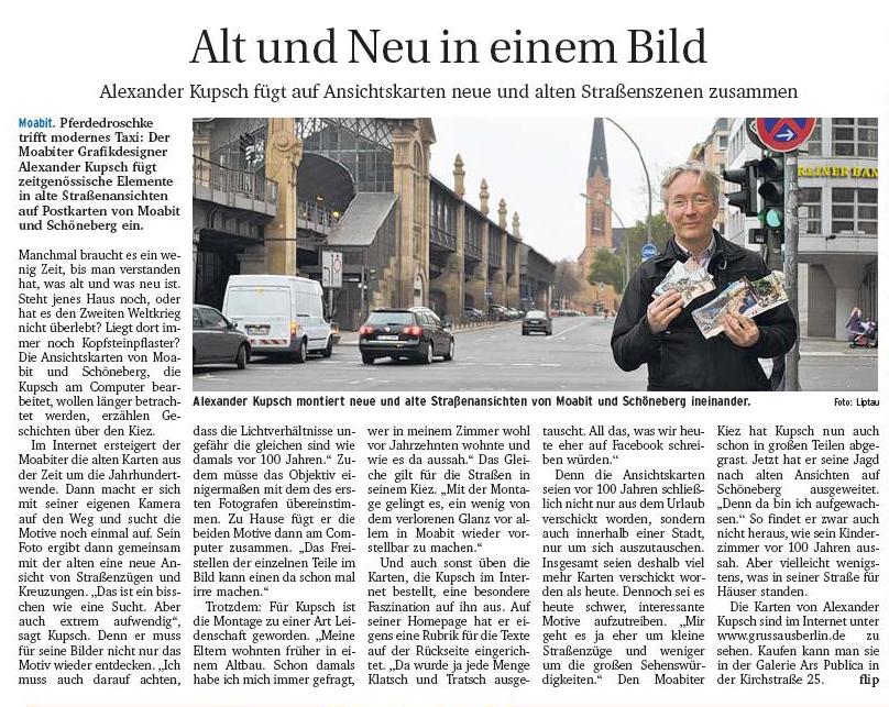 Moabit hat eine Geschichte, die im vorletzten Jahrhundert so richtig Fahrt aufnahm. Nach Raupenzucht, Seehandlung, Porzellanmanufaktur und Maschinenbauanstalt kamen endlich auch Bewohner. Der Ort entwickelte sich zum Wohnquartier und viele Gebäude aus dieser Zeit stehen noch heute. Doch Krieg, Flächensanierung und geplanter Autobahnbau haben einen Teil Moabits vernichtet. Glücklicherweise aber gibt es noch alte Fotografien und so hat sich Alexander Kupsch daran gemacht, das alte und das neue Moabit miteinander zu vergleichen. Seine Fotos montierte er mit alten Postkarten und schuf so einen interessanten Einblick in einige Orte unseres Kiezes.