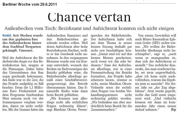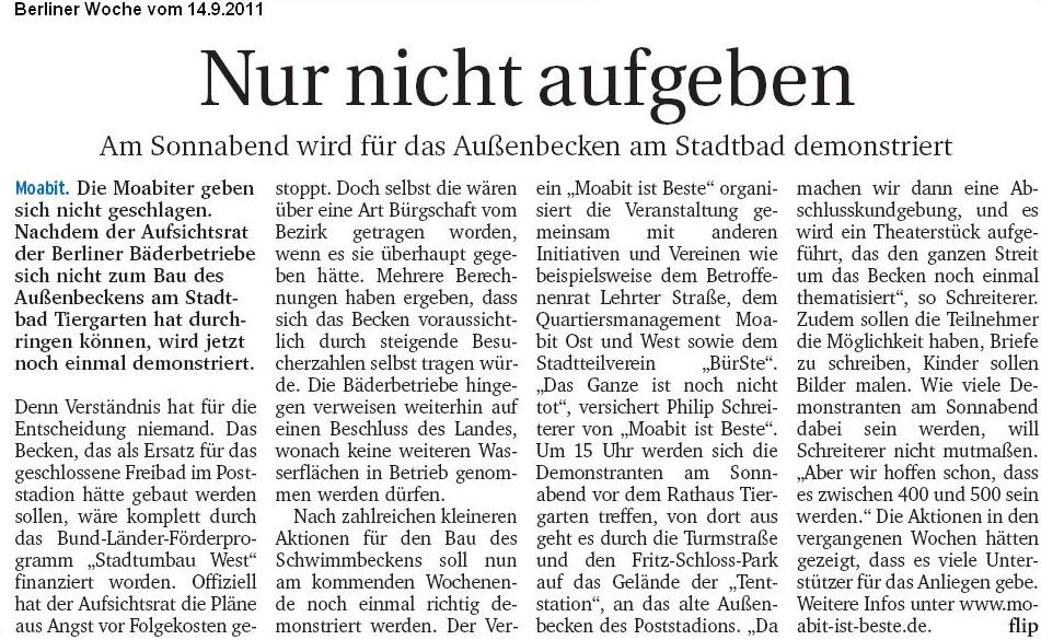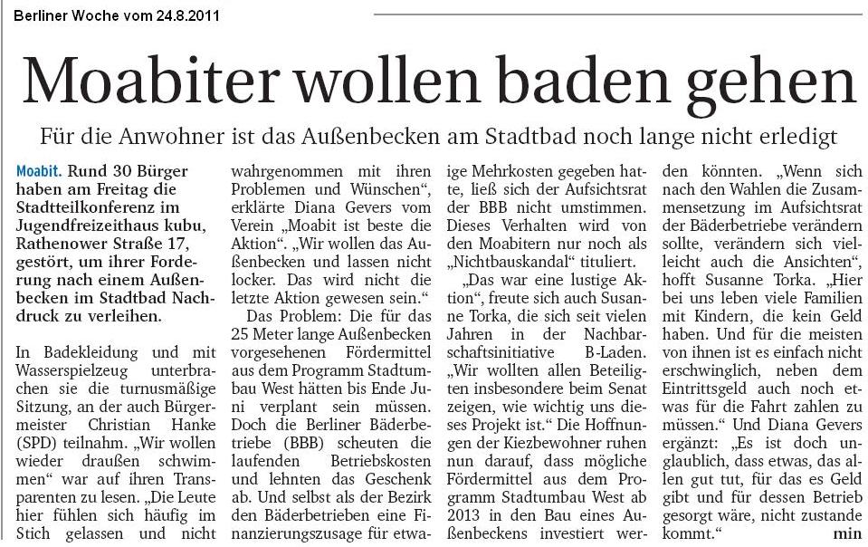 Und in der Berliner Woche am 22. Juni : Reden, reden, reden, am 29. Juni: Chance vertan, auf der Stadtumbau Berlin Seite: die Eröffnung des Pavillons. Schreiben von Senator Körting vom 1.8.2011 (er versucht zu erklären, warum es nicht geht). Berliner Woche vom 24.8.2011: Moabiter wollen baden gehen.