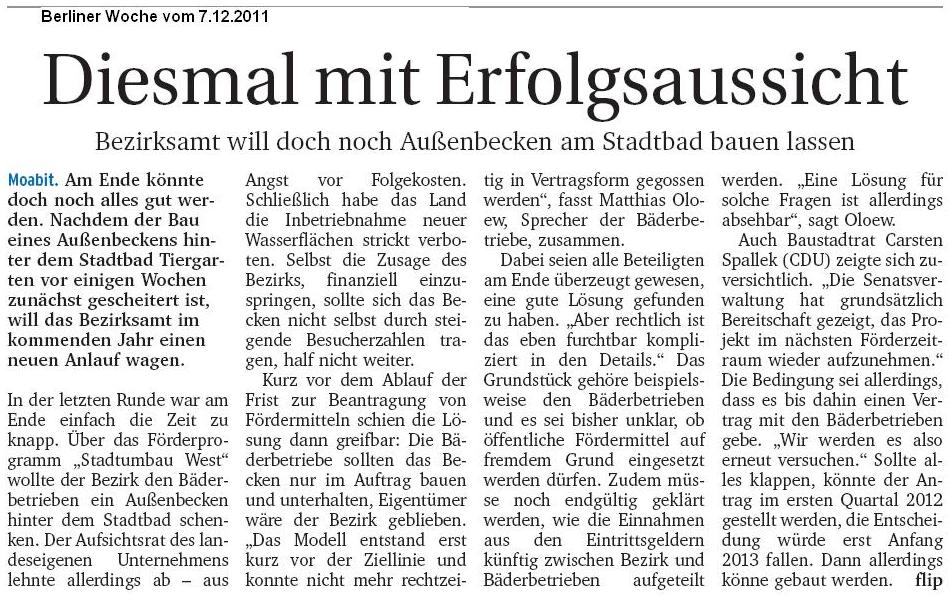 Berliner Woche vom 7.12.2011 berichtet, dass es für 2012 Erfolgsaussichten gibt. Das Außenbecken wird wieder neu in das Förderprogramm Stadtumbau West hineingenommen. Jetzt muss der Vertrag zwischen Bezirk und BBB rechtzeitig ausgehandelt und unterzeichnet werden.